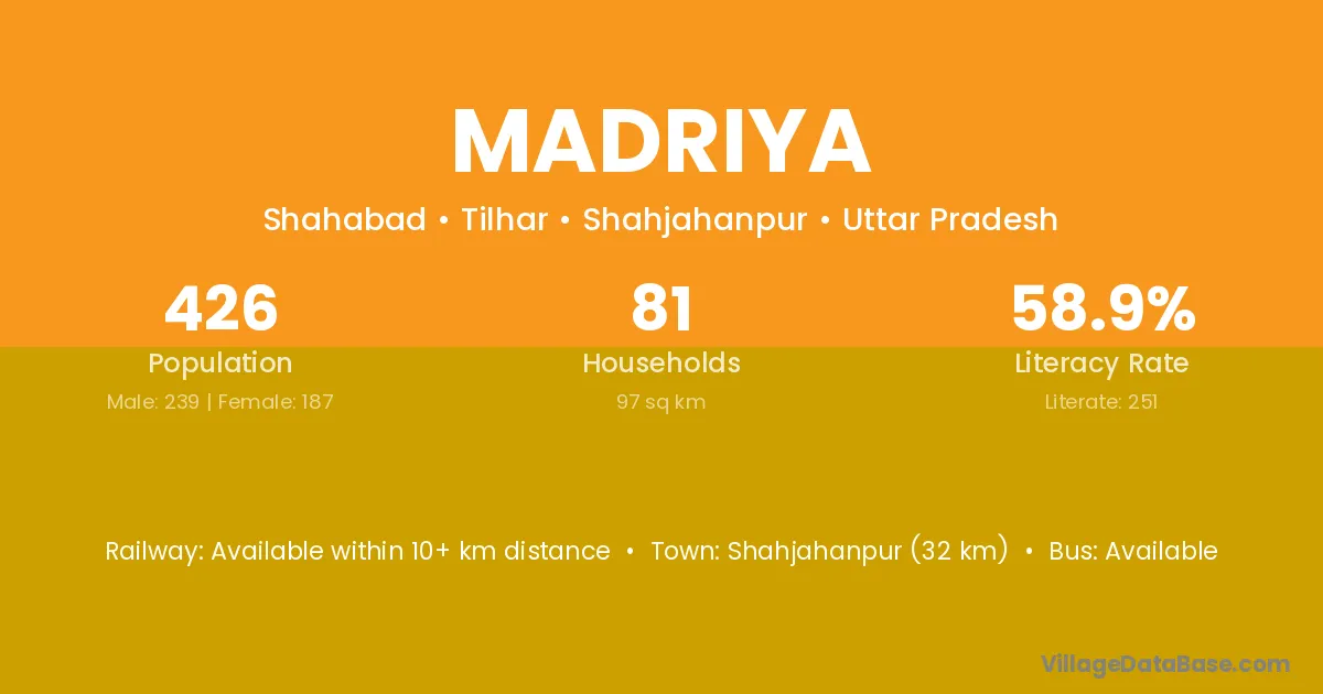 Shahjahanpur (32 km) is the nearest town to Madriya village for major economic activities and is located approximately 32 km away.