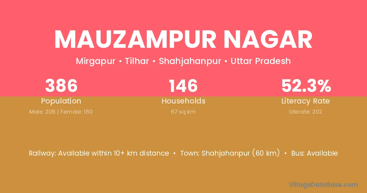 Mauzampur Nagar village has a total population of 386 people, of which 206 are males and 180 are females.