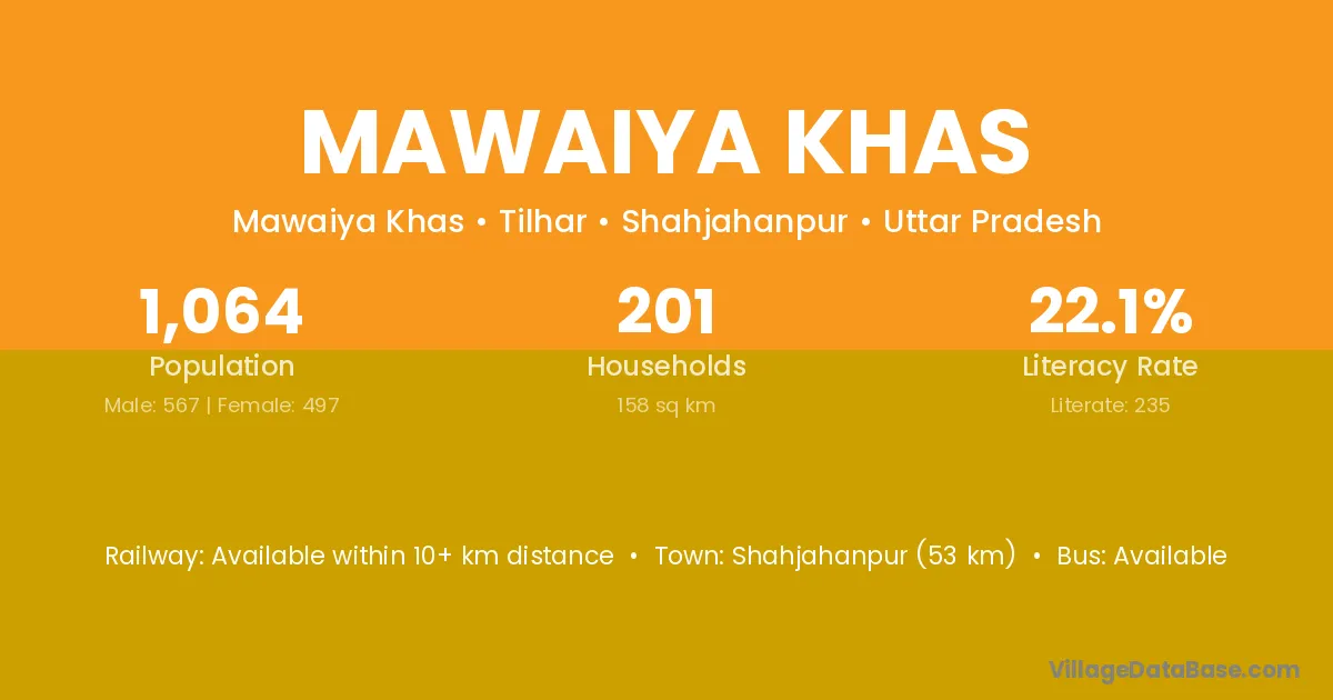 Mawaiya Khas village has a total population of 1,064 people, of which 567 are males and 497 are females.