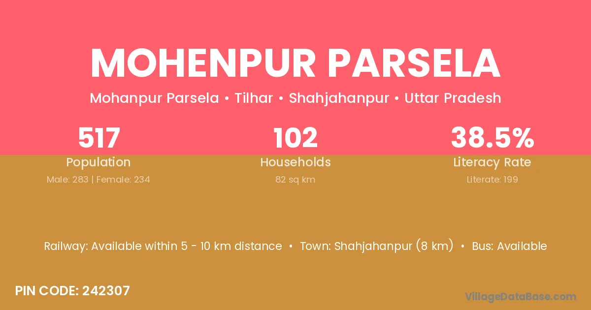 Shahjahanpur (8 km) is the nearest town to Mohenpur Parsela village for major economic activities and is located approximately 8 km away.