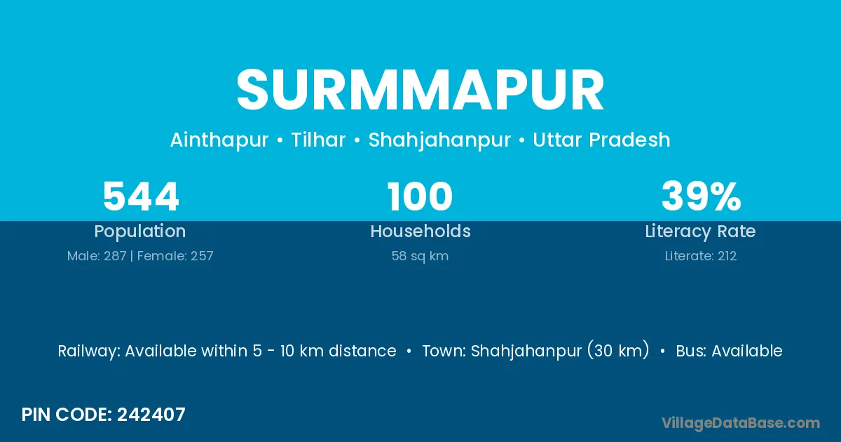 Shahjahanpur (30 km) is the nearest town to Surmmapur village for major economic activities and is located approximately 30 km away.