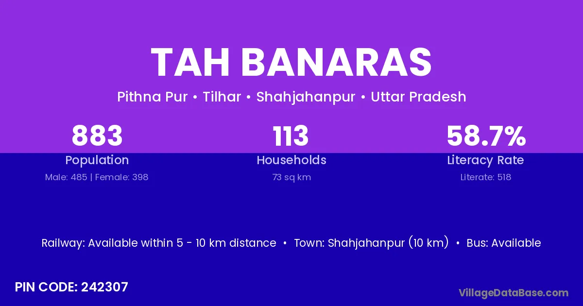 Shahjahanpur (10 km) is the nearest town to Tah Banaras village for major economic activities and is located approximately 10 km away.