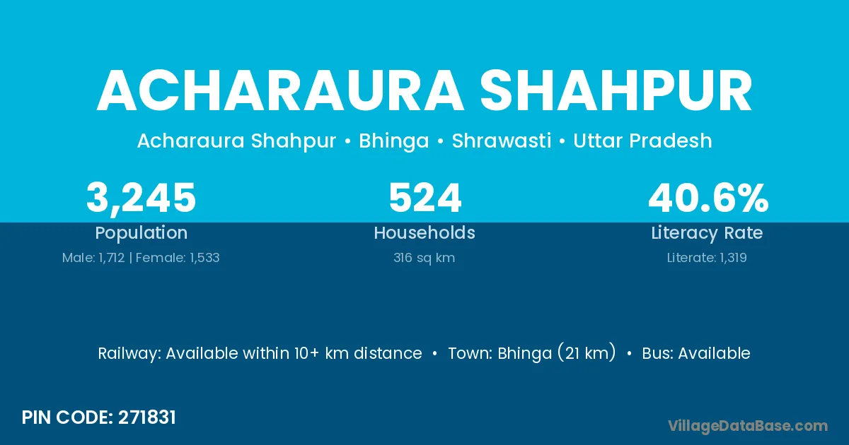 Bhinga (21 km) is the nearest town to Acharaura Shahpur village for major economic activities and is located approximately 21 km away.