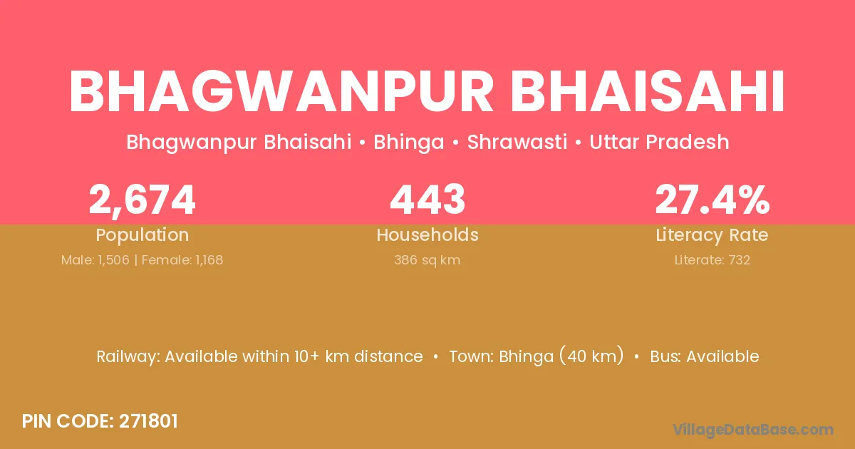 Bhinga (40 km) is the nearest town to Bhagwanpur Bhaisahi village for major economic activities and is located approximately 40 km away.