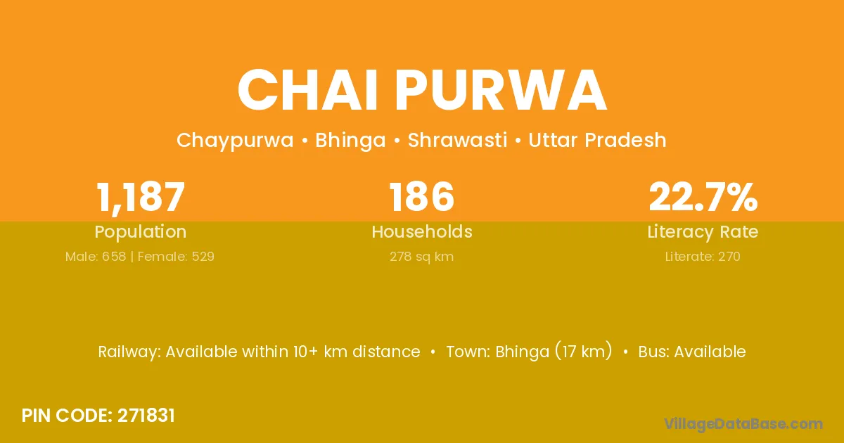 Bhinga (17 km) is the nearest town to Chai Purwa village for major economic activities and is located approximately 17 km away.