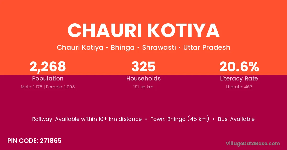 Bhinga (45 km) is the nearest town to Chauri Kotiya village for major economic activities and is located approximately 45 km away.