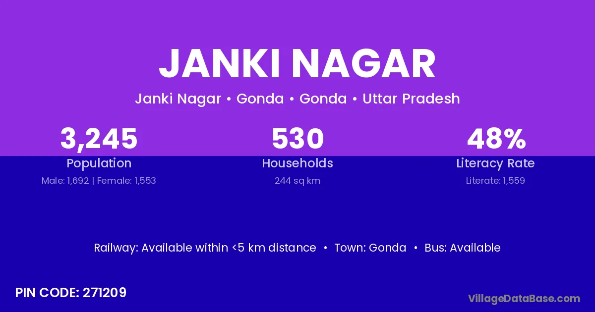 Bhinga (55 km) is the nearest town to Janki Nagar village for major economic activities and is located approximately 55 km away.