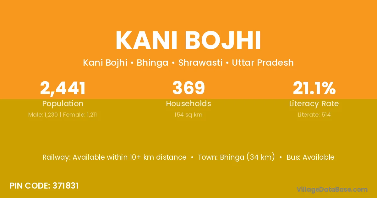 Bhinga (34 km) is the nearest town to Kani Bojhi village for major economic activities and is located approximately 34 km away.