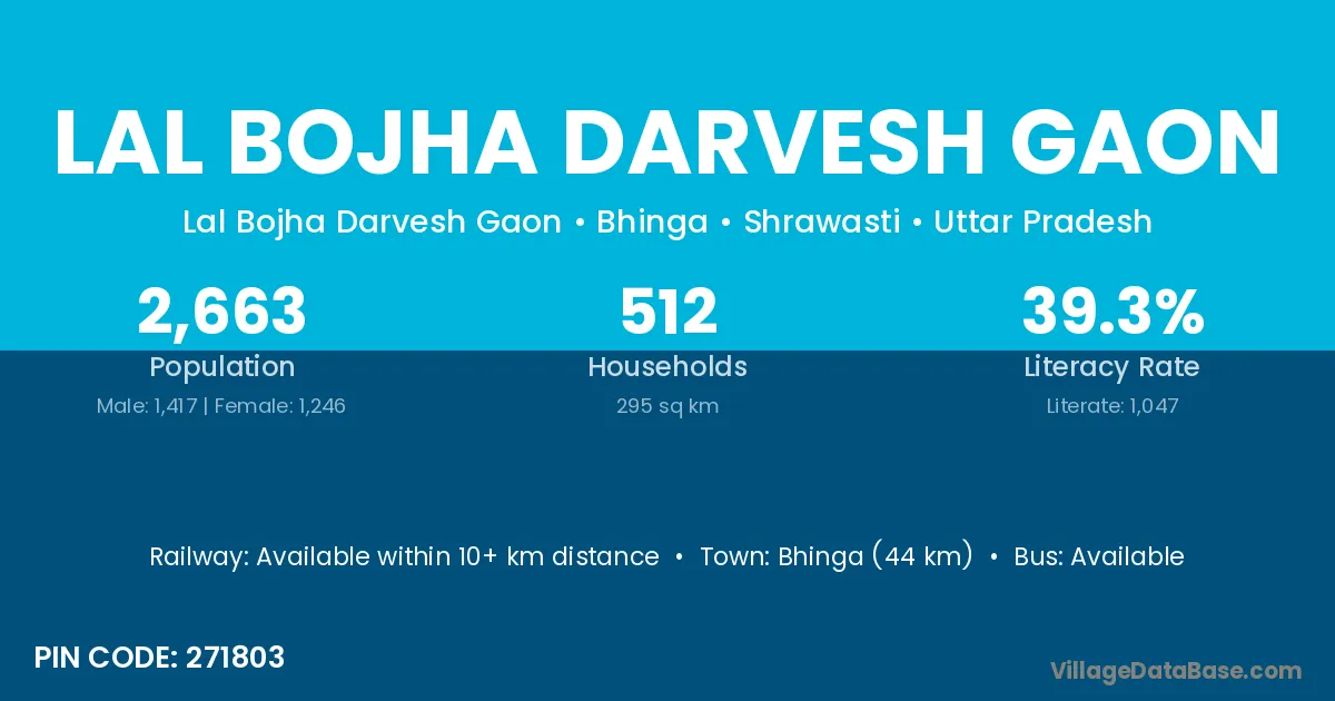 Bhinga (44 km) is the nearest town to Lal Bojha Darvesh Gaon village for major economic activities and is located approximately 44 km away.
