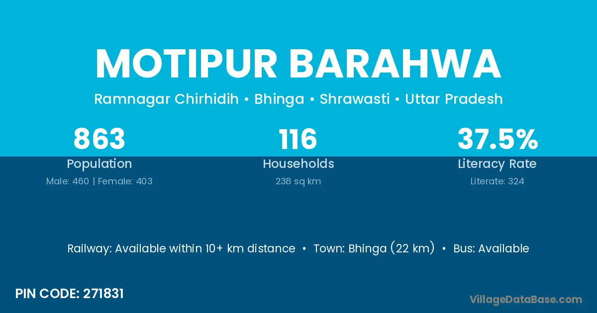 Bhinga (22 km) is the nearest town to Motipur Barahwa village for major economic activities and is located approximately 22 km away.