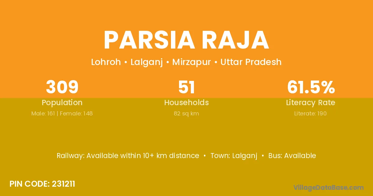 The literacy rate of Parsia Raja village is 38.90%. Male literacy stands at 49.74% and female literacy at 27.21%.