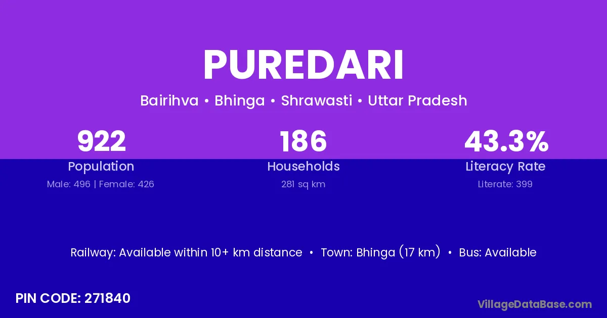 Bhinga (17 km) is the nearest town to Puredari village for major economic activities and is located approximately 17 km away.