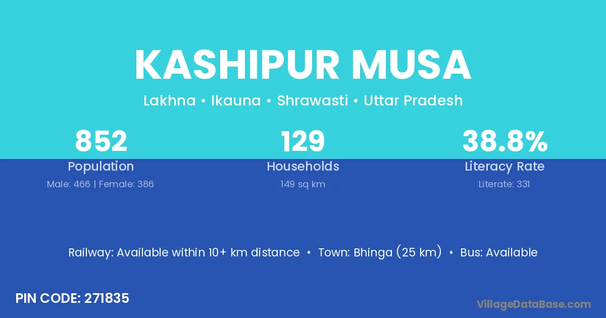 Bhinga (25 km) is the nearest town to Kashipur Musa village for major economic activities and is located approximately 25 km away.