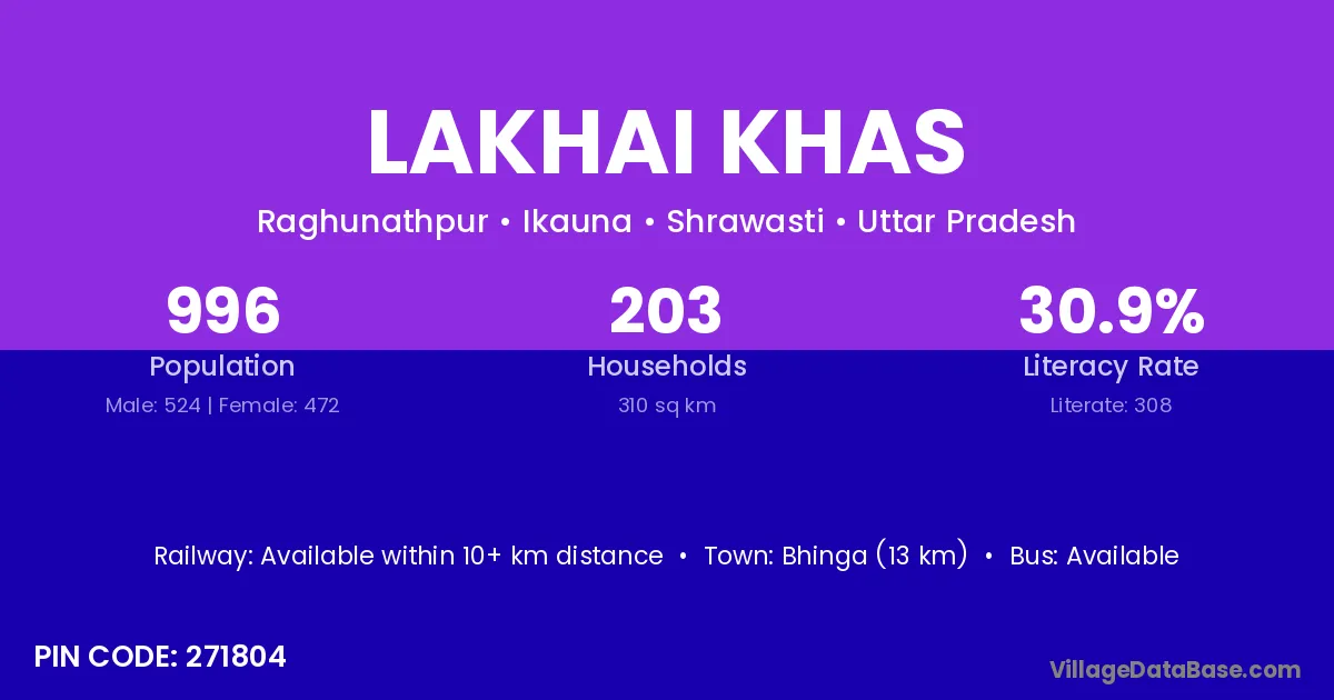 Bhinga (13 km) is the nearest town to Lakhai Khas village for major economic activities and is located approximately 13 km away.