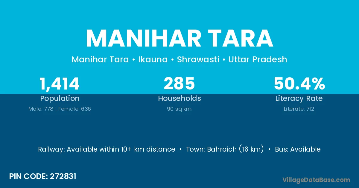 Bahraich (16 km) is the nearest town to Manihar Tara village for major economic activities and is located approximately 16 km away.