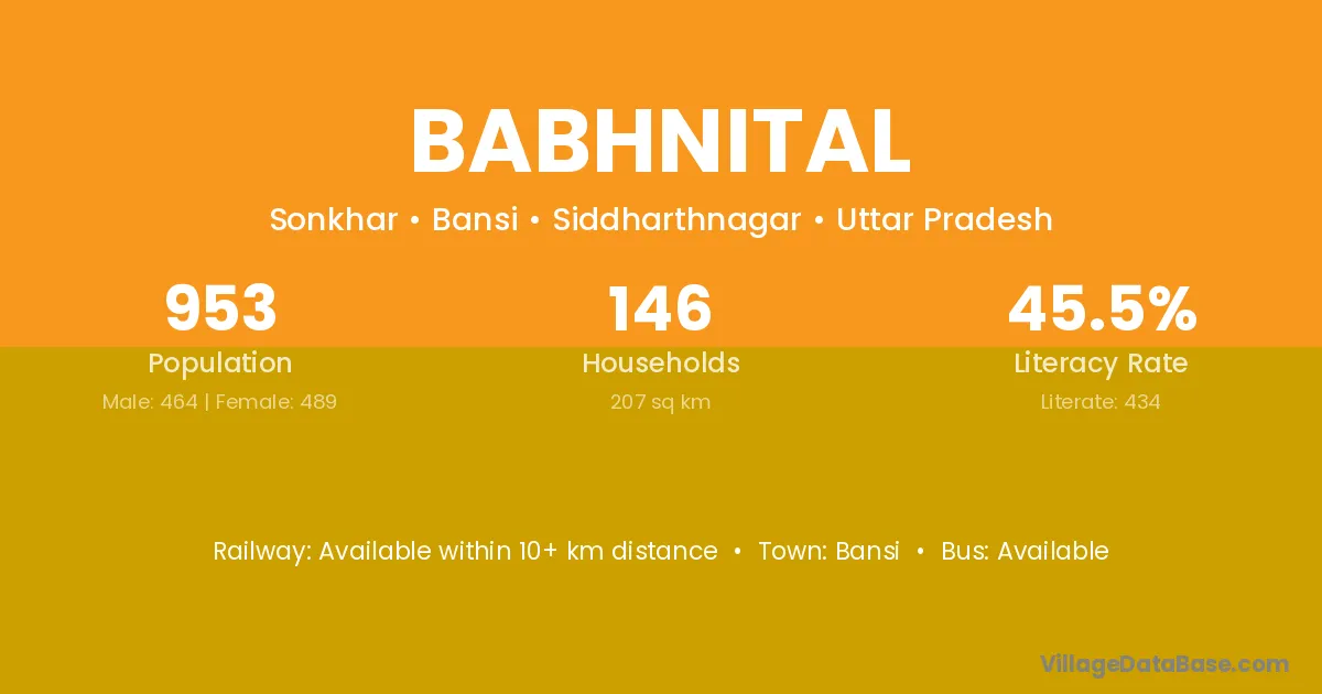 Babhnital village has a total population of 953 people, of which 464 are males and 489 are females.