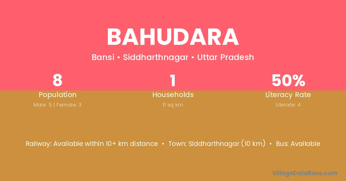 Siddharthnagar (10 km) is the nearest town to Bahudara village for major economic activities and is located approximately 10 km away.