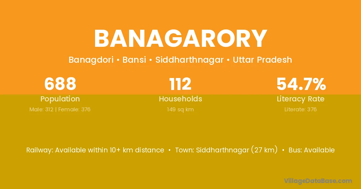 Siddharthnagar (27 km) is the nearest town to Banagarory village for major economic activities and is located approximately 27 km away.