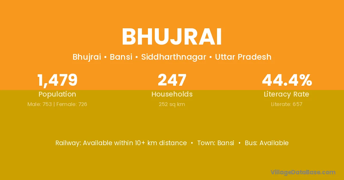 Bhujrai village has a total population of 1,479 people, of which 753 are males and 726 are females.