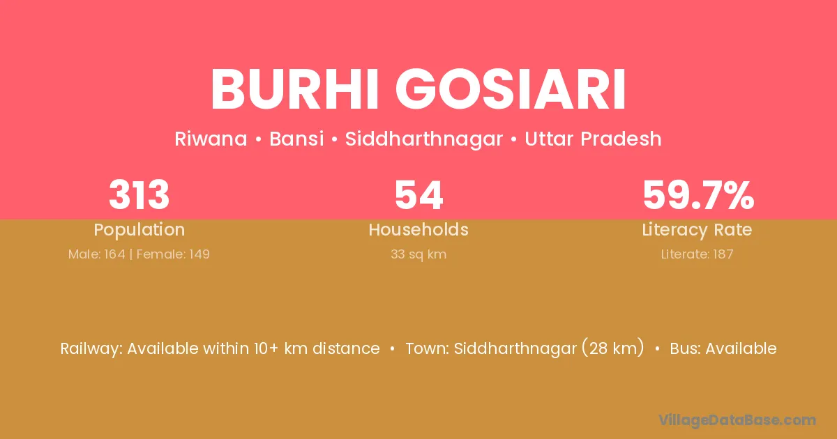Siddharthnagar (28 km) is the nearest town to Burhi Gosiari village for major economic activities and is located approximately 28 km away.