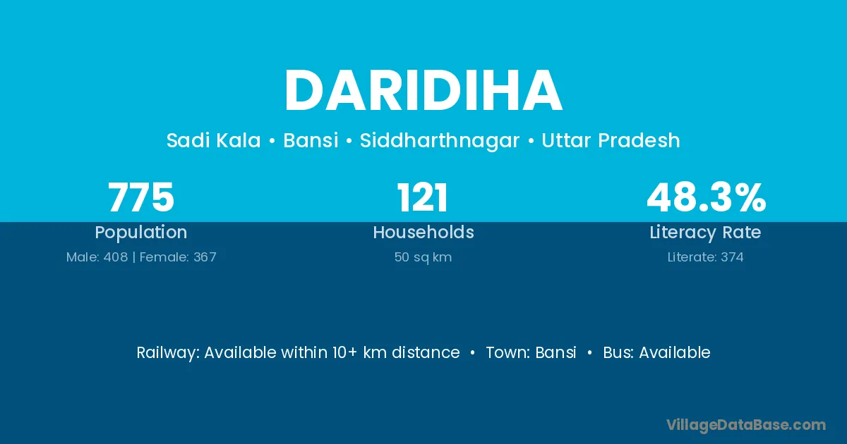 Daridiha village has a total population of 775 people, of which 408 are males and 367 are females.
