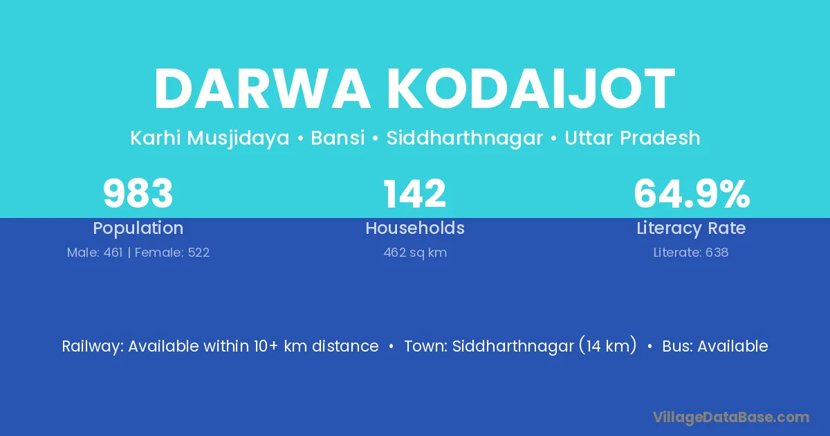 Siddharthnagar (14 km) is the nearest town to Darwa Kodaijot village for major economic activities and is located approximately 14 km away.
