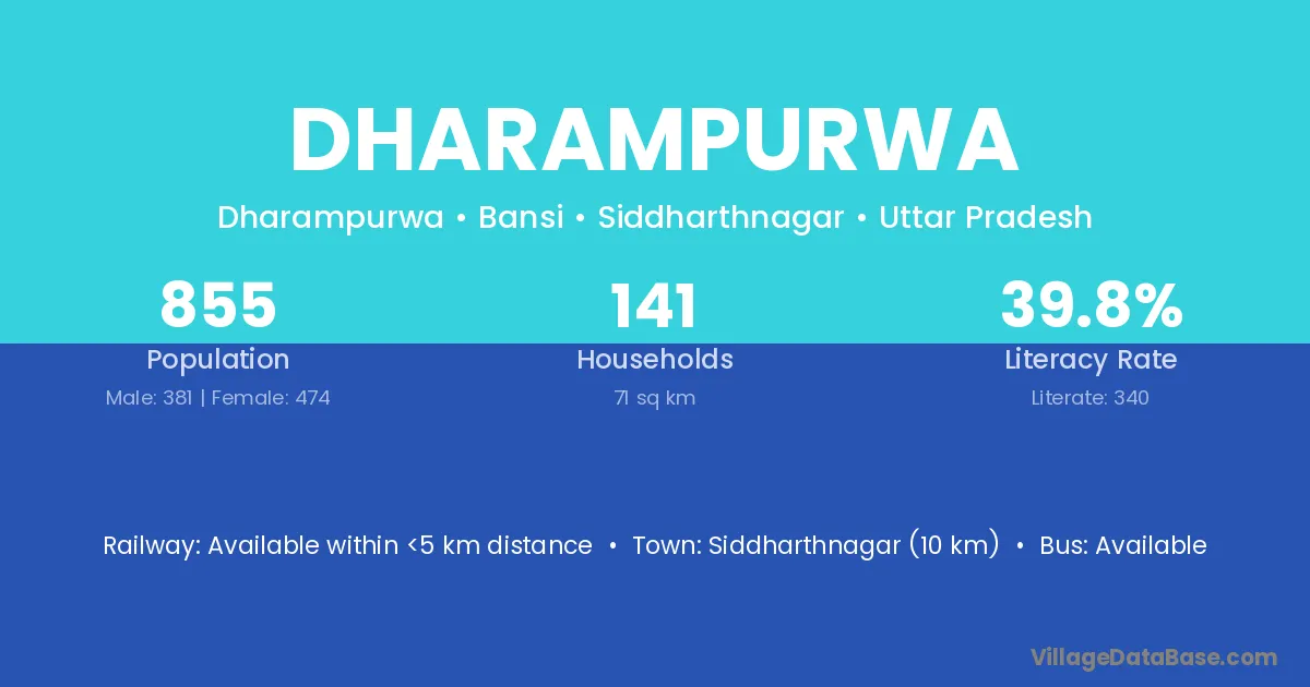 Siddharthnagar (10 km) is the nearest town to Dharampurwa village for major economic activities and is located approximately 10 km away.
