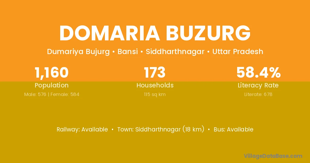 Siddharthnagar (18 km) is the nearest town to Domaria Buzurg village for major economic activities and is located approximately 18 km away.