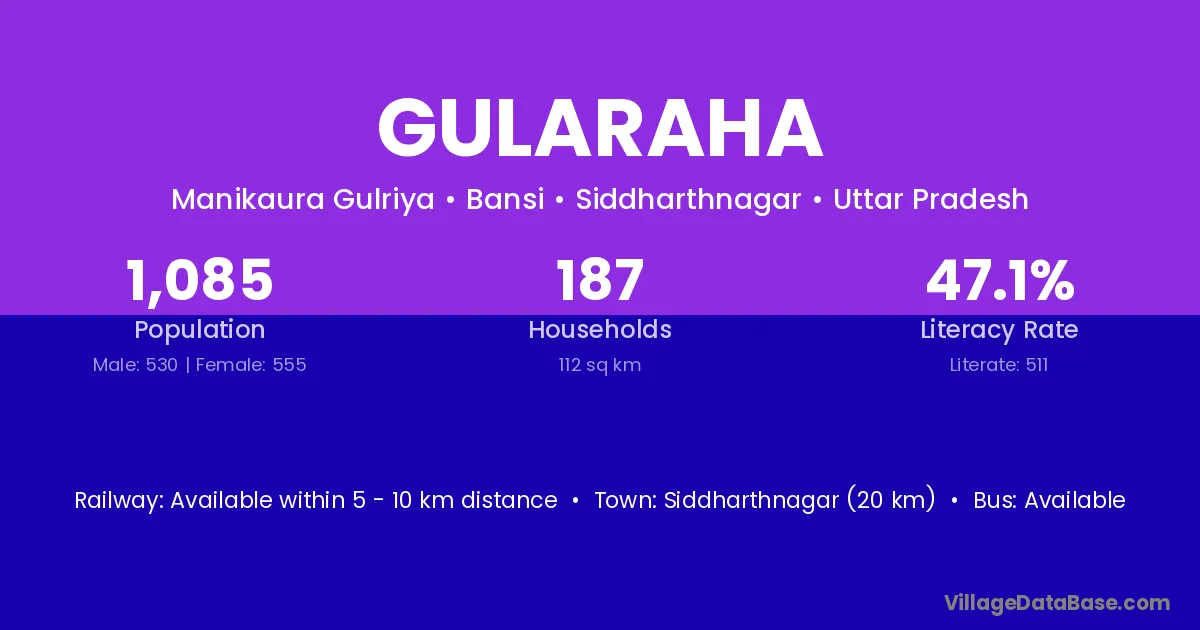 Siddharthnagar (20 km) is the nearest town to Gularaha village for major economic activities and is located approximately 20 km away.