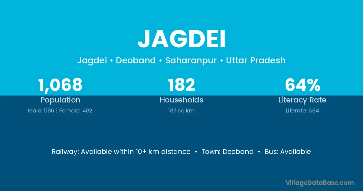 The literacy rate of Jagdei village is 29.84%. Male literacy stands at 34.53% and female literacy at 23.85%.