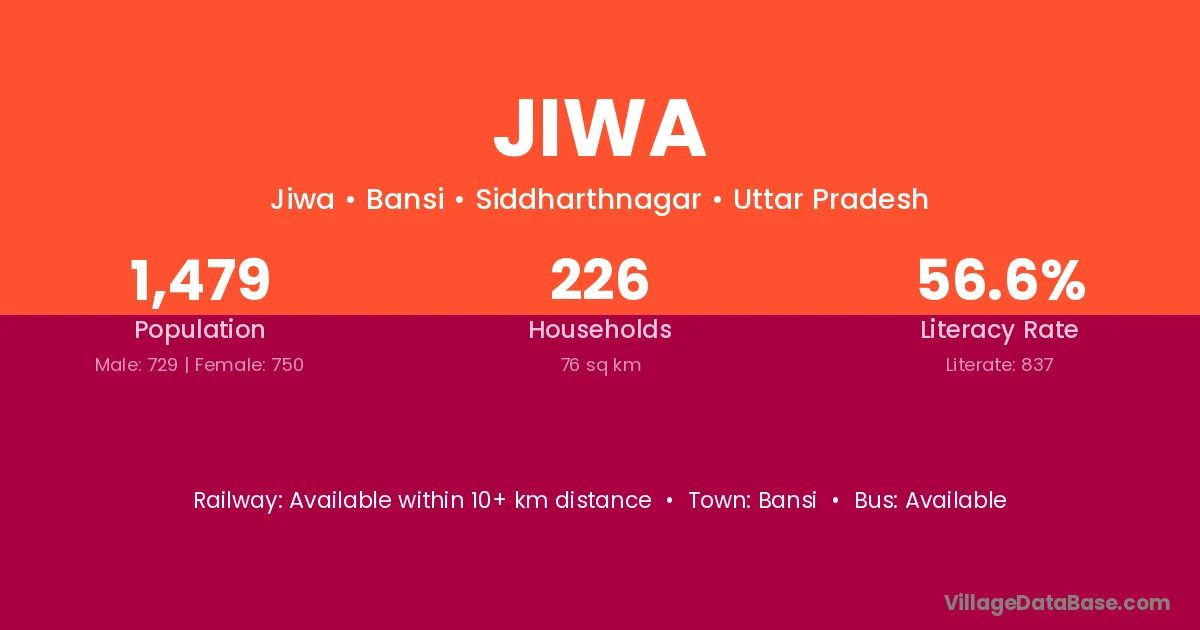 The literacy rate of Jiwa village is 56.59%. Male literacy stands at 66.39% and female literacy at 47.07%.