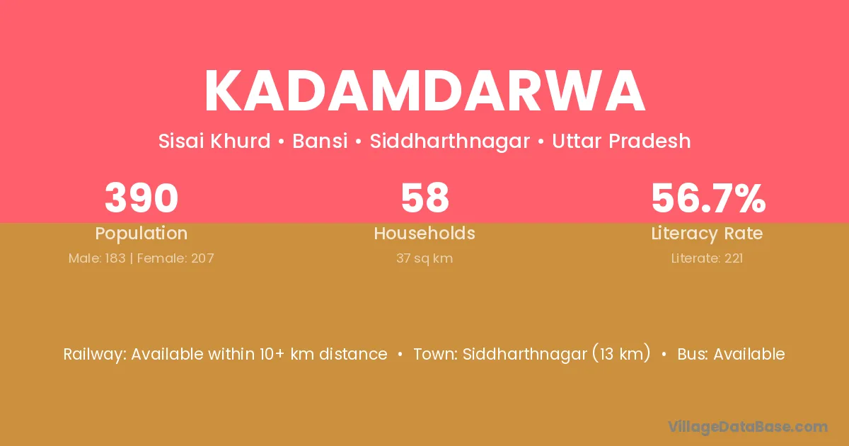Siddharthnagar (13 km) is the nearest town to Kadamdarwa village for major economic activities and is located approximately 13 km away.