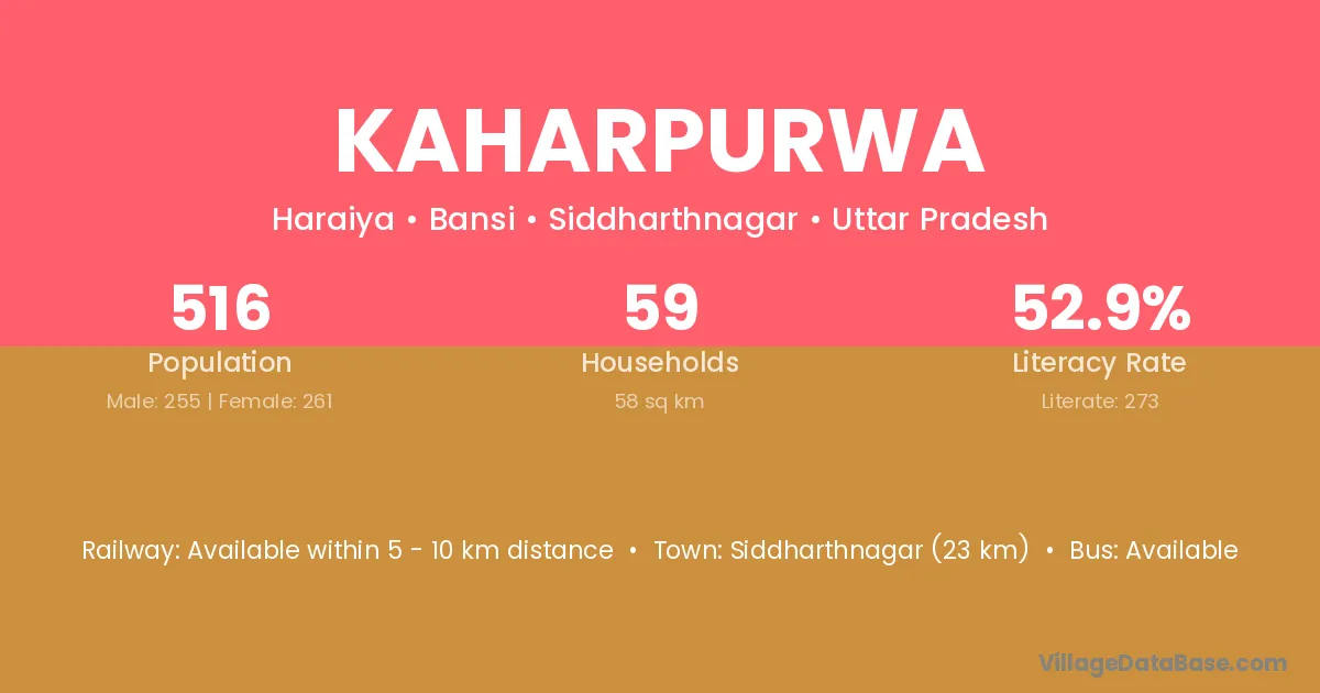 Kaharpurwa village has a total population of 516 people, of which 255 are males and 261 are females.