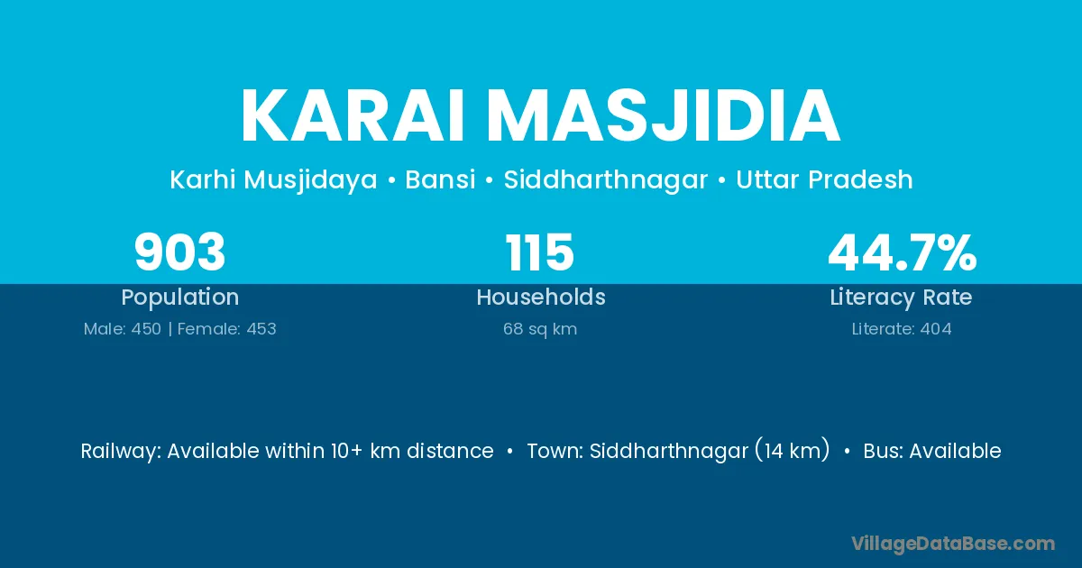 Karai Masjidia village has a total population of 903 people, of which 450 are males and 453 are females.