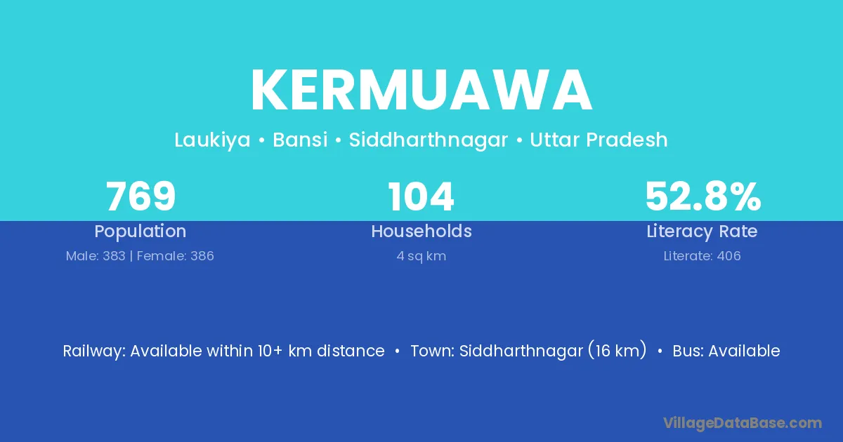 Siddharthnagar (16 km) is the nearest town to Kermuawa village for major economic activities and is located approximately 16 km away.