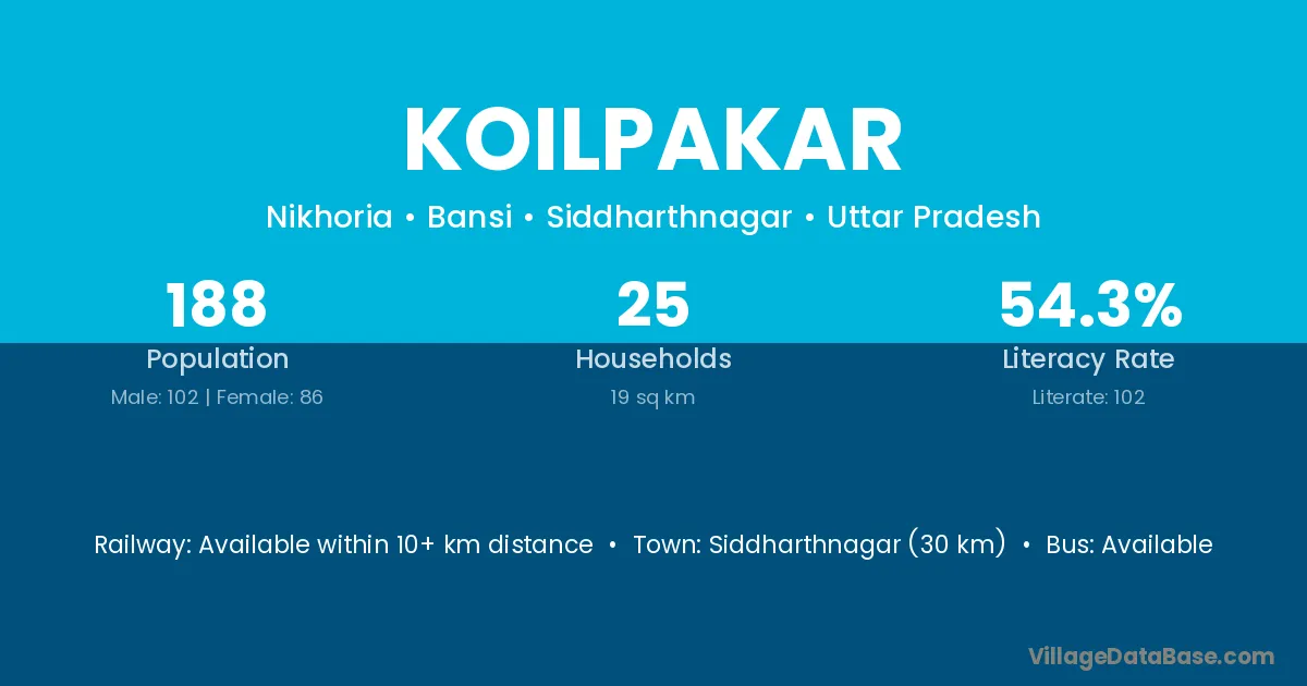 Siddharthnagar (30 km) is the nearest town to Koilpakar village for major economic activities and is located approximately 30 km away.
