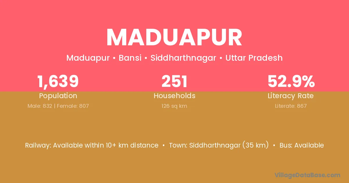 Siddharthnagar (35 km) is the nearest town to Maduapur village for major economic activities and is located approximately 35 km away.