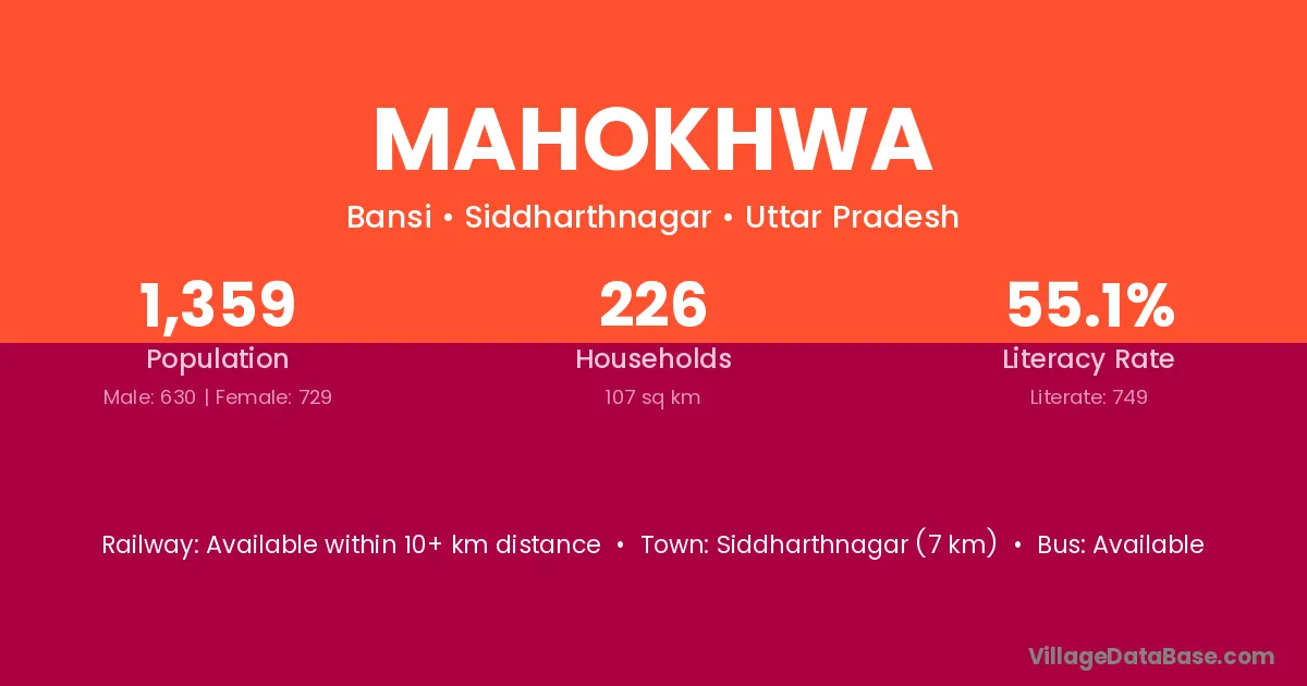 Siddharthnagar (7 km) is the nearest town to Mahokhwa village for major economic activities and is located approximately 7 km away.