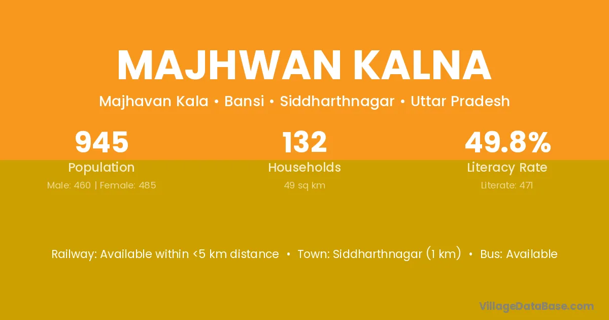 Siddharthnagar (1 km) is the nearest town to Majhwan Kalna village for major economic activities and is located approximately 1 km away.
