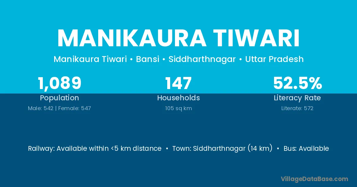 Siddharthnagar (14 km) is the nearest town to Manikaura Tiwari village for major economic activities and is located approximately 14 km away.