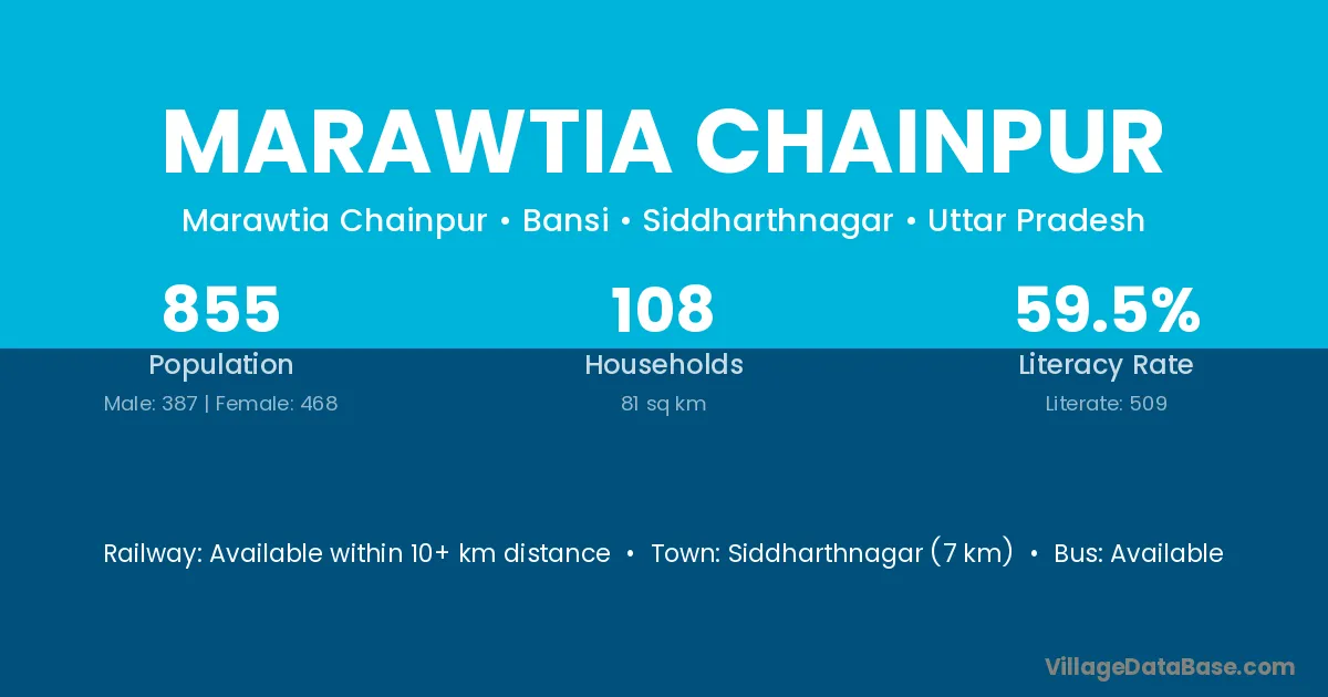 Siddharthnagar (7 km) is the nearest town to Marawtia Chainpur village for major economic activities and is located approximately 7 km away.