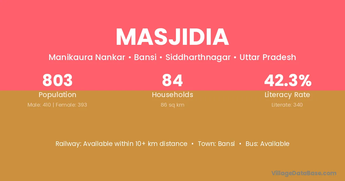 Masjidia village has a total population of 803 people, of which 410 are males and 393 are females.