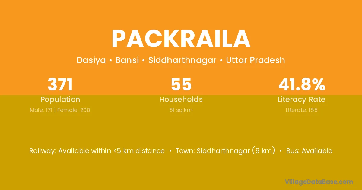 Siddharthnagar (9 km) is the nearest town to Packraila village for major economic activities and is located approximately 9 km away.