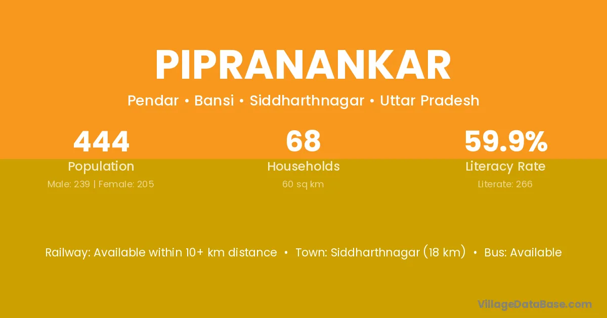 Siddharthnagar (18 km) is the nearest town to Pipranankar village for major economic activities and is located approximately 18 km away.