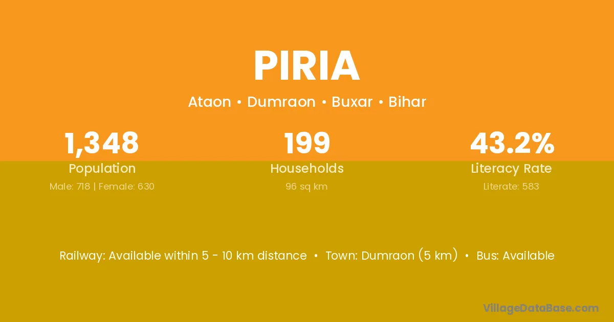 The literacy rate of Piria village is 58.90%. Male literacy stands at 72.27% and female literacy at 46.38%.