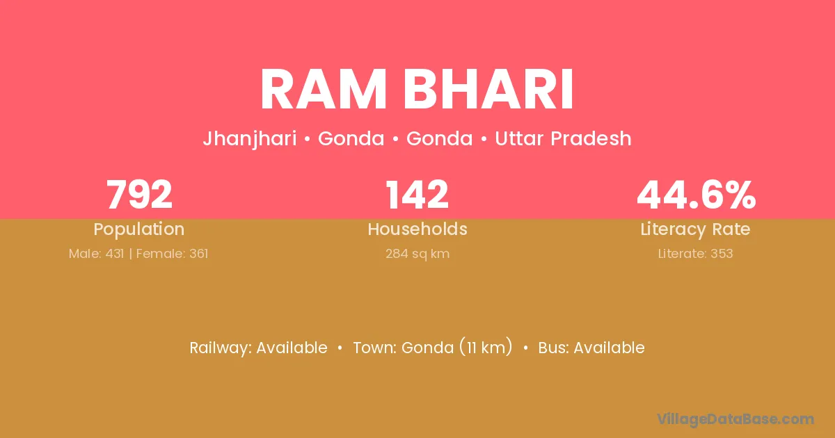 Ram Bhari village has a total population of 1,065 people, of which 543 are males and 522 are females.