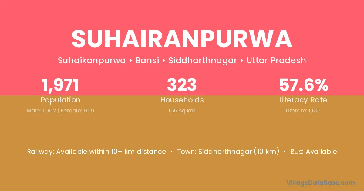 Siddharthnagar (10 km) is the nearest town to Suhairanpurwa village for major economic activities and is located approximately 10 km away.