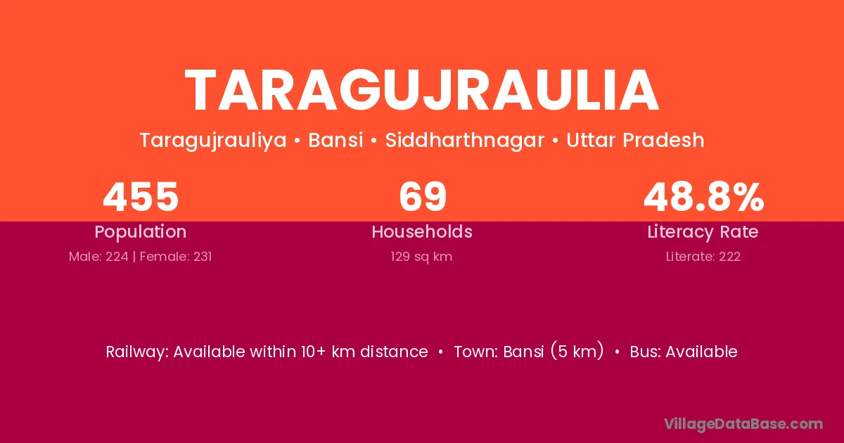 Taragujraulia village has a total population of 455 people, of which 224 are males and 231 are females.