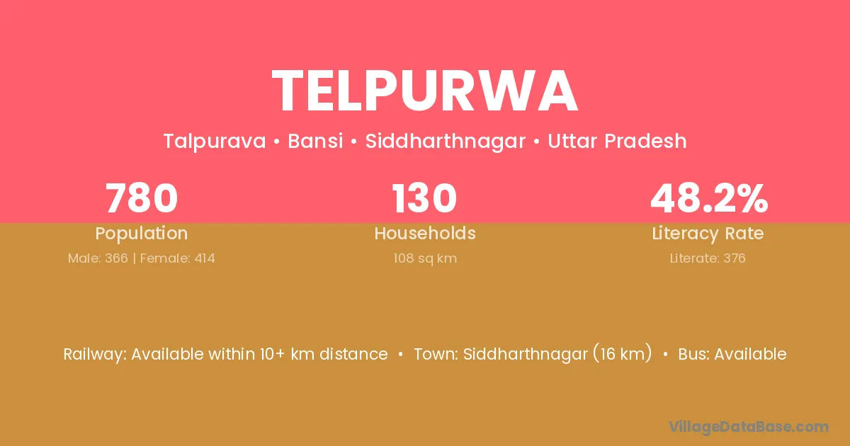 Siddharthnagar (16 km) is the nearest town to Telpurwa village for major economic activities and is located approximately 16 km away.