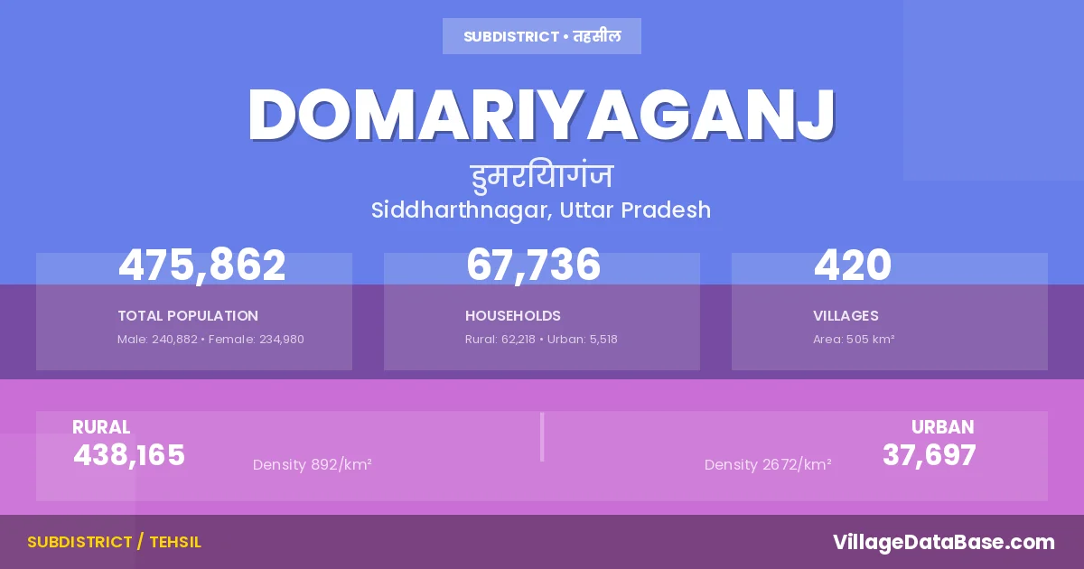 According to the 2011 census The total area of Domariyaganj Tehsil is 505 km², with a population of 475862 people. The population density is 941 inhabitants per square kilometre, and there are approximately 67736 houses in the sub district.